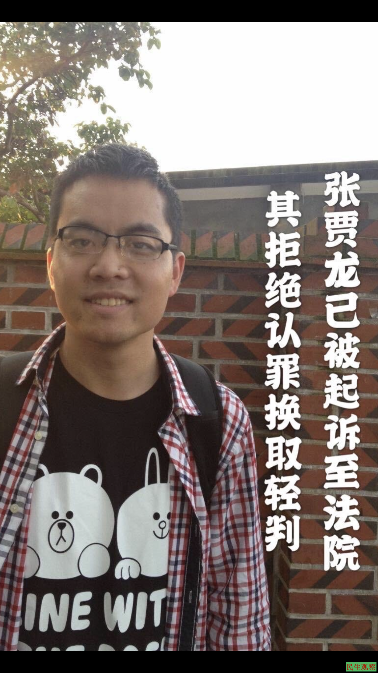 【民生观察2019年12月4日消息】本网获悉,前媒体人贵州张贾龙已被提起公诉,消息指,当局曾规劝张贾龙写材料认罪,换取轻判发落,但遭到张贾龙拒绝。