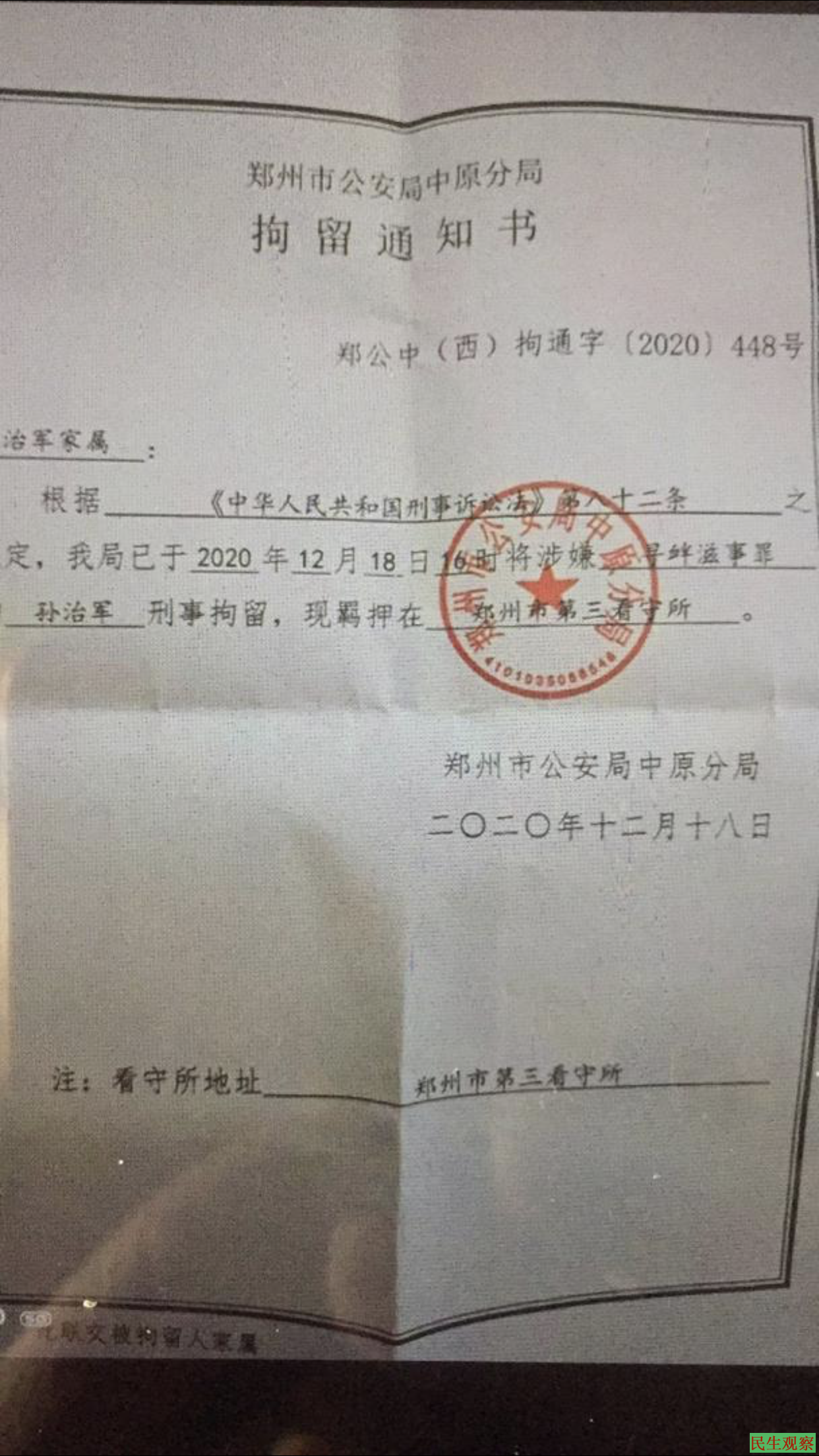 大约晚上7点左右,孙治军送到了郑州第三看守所;19日早上家属收到了孙治军被刑事的《拘留通知书》。