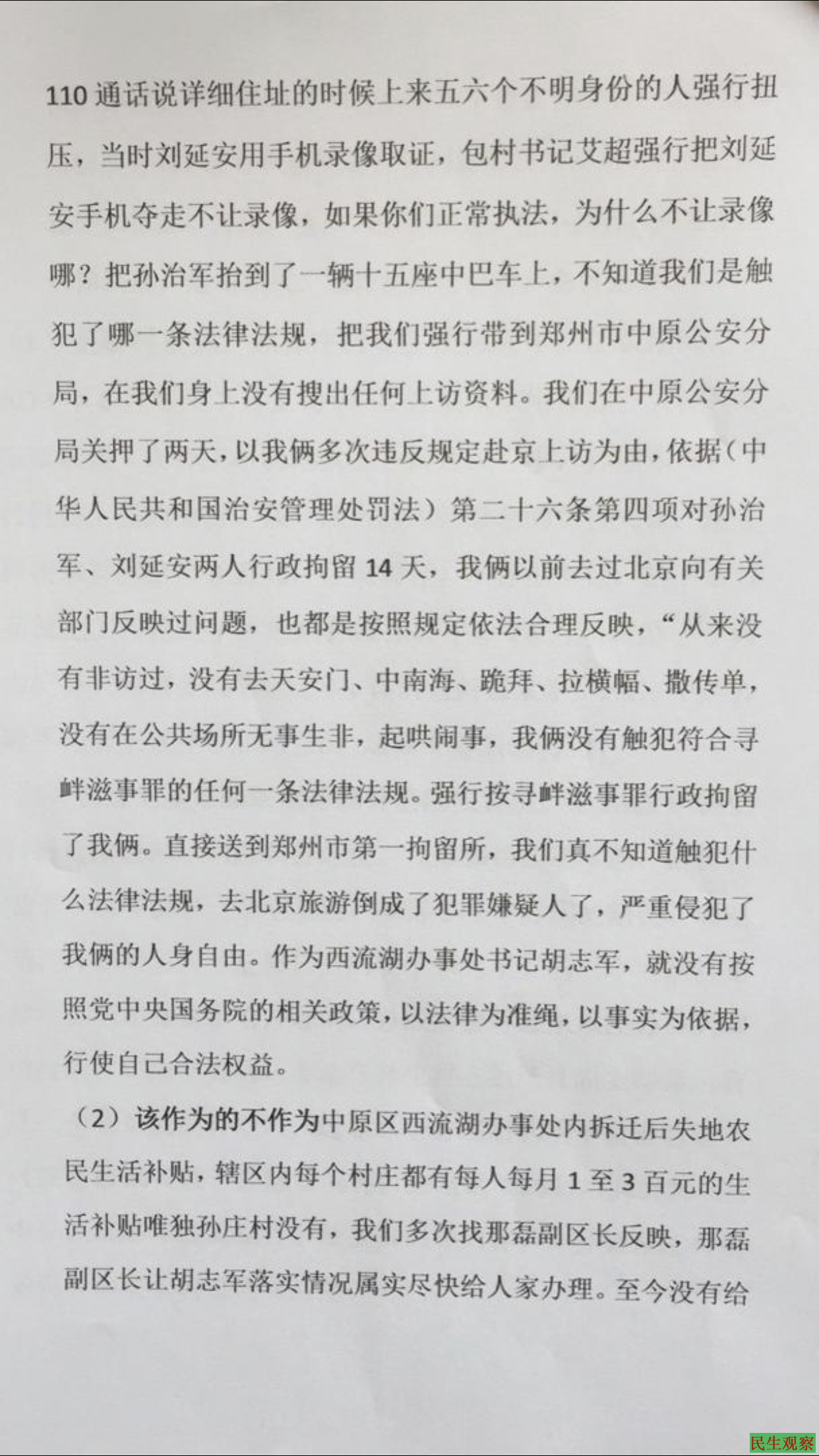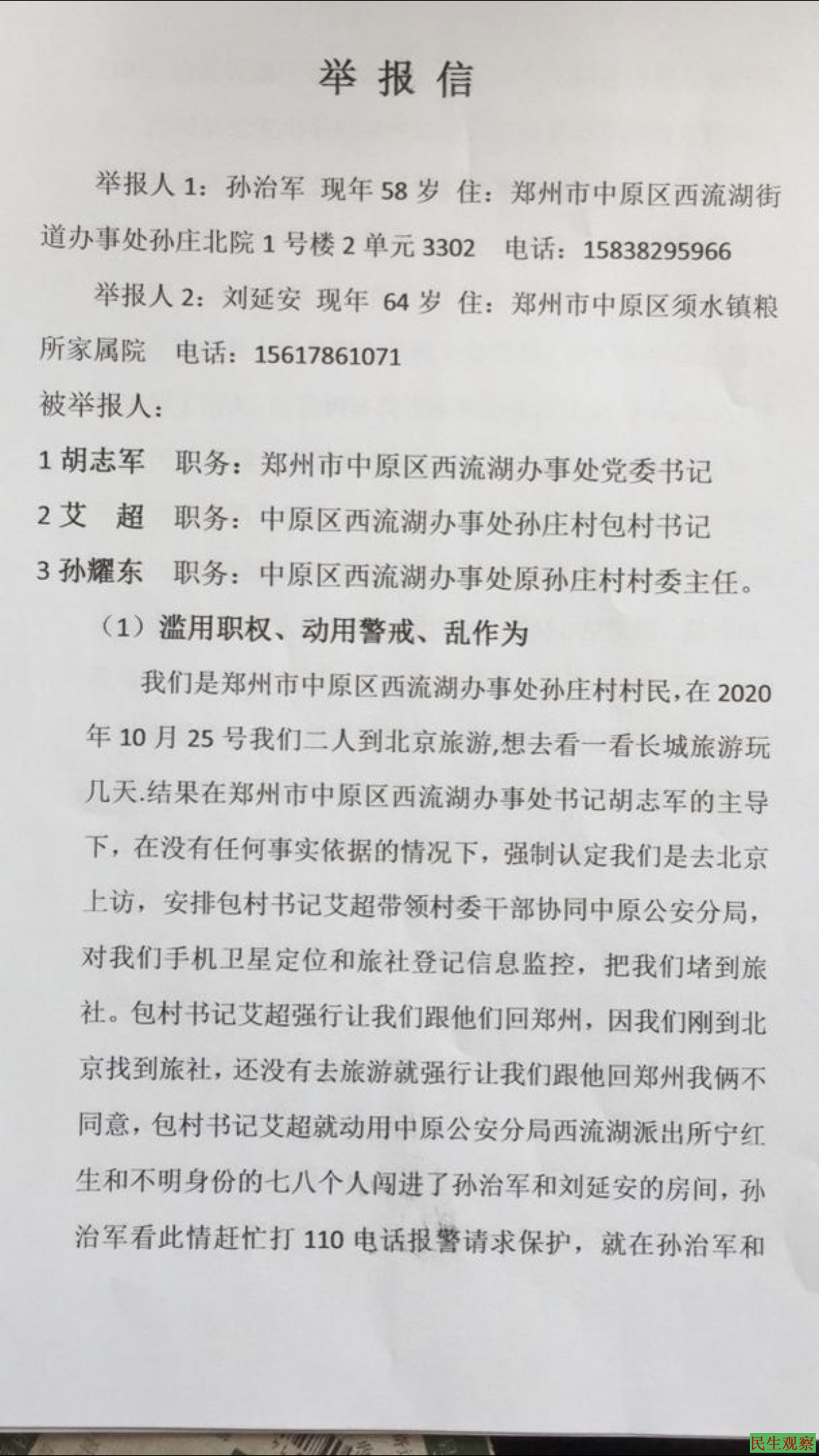 12月17日,孙治军和刘延安又到信访局实名举报了郑州市中原区西流湖办事处书记胡志军、中原区西流湖办事处孙庄包村书记艾超、以及中原区西流湖办事处原孙庄村村委会主任孙耀东。