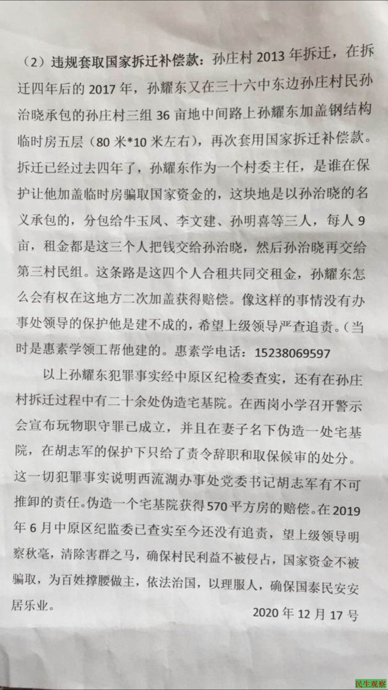 举报内容,以上三位干部:滥用职权、动用警械、乱作为;垄断村资源;伪造宅基证骗取宅基院补偿的安置房;违规套取国家迁拆补偿款等(此内容来源于孙治军、刘延安《举报信》)。