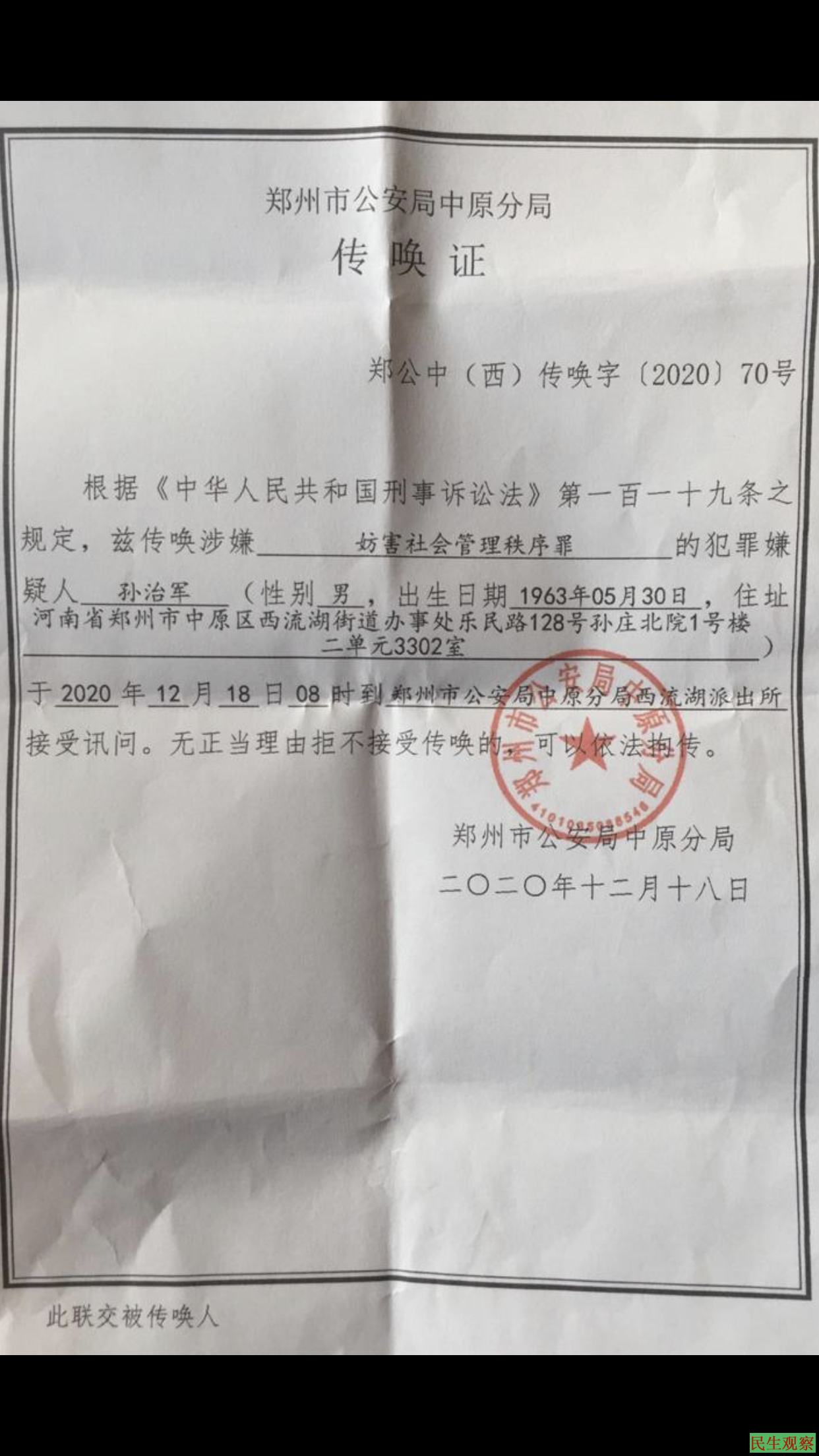 据知情人士透露,12月18日早上7点多,郑州市公安局中原分局西流湖派出所民警到郑州市中原区西流湖街道孙庄孙治军家中,以其涉嫌“妨害社会管理秩序罪”口头传唤他到派出所去一趟。孙治军向警察索要《传唤证》未果,拒绝与其前往。