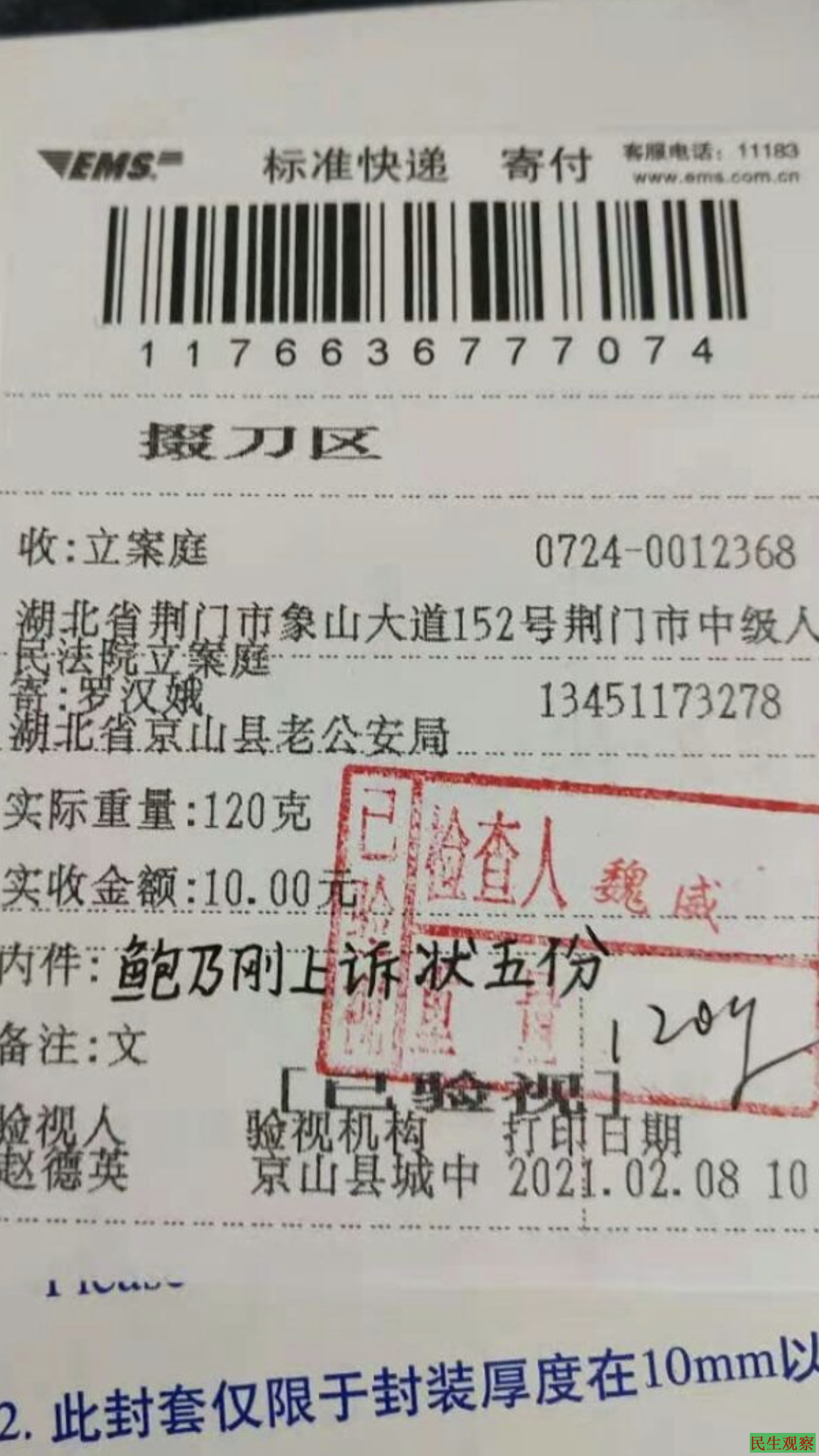 【民生观察2021年2月17日消息】2021年2月3日,鲍乃刚在京山市看守所以涉嫌寻衅滋事罪一案,鲍乃刚被判刑有期徒刑四年。鲍乃刚表示要上诉。