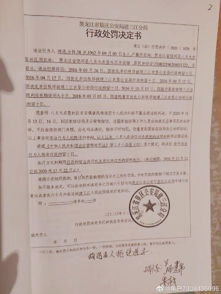 2020年12月12日,在被关押在859农场派出所办案区两天后,建三江分局作出了(2020)建公(治)行罚决字1070号决定,杨浩被送到同江拘留所执行拘留10日。