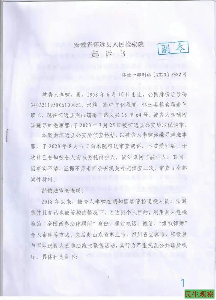【民生观察2022年4月14日消息】安徽退役老兵李啸涉嫌寻衅滋事罪的开庭,2022年3月30日上午李啸寻衅滋事罪开庭。李啸,身份证号码:340321195806100051。