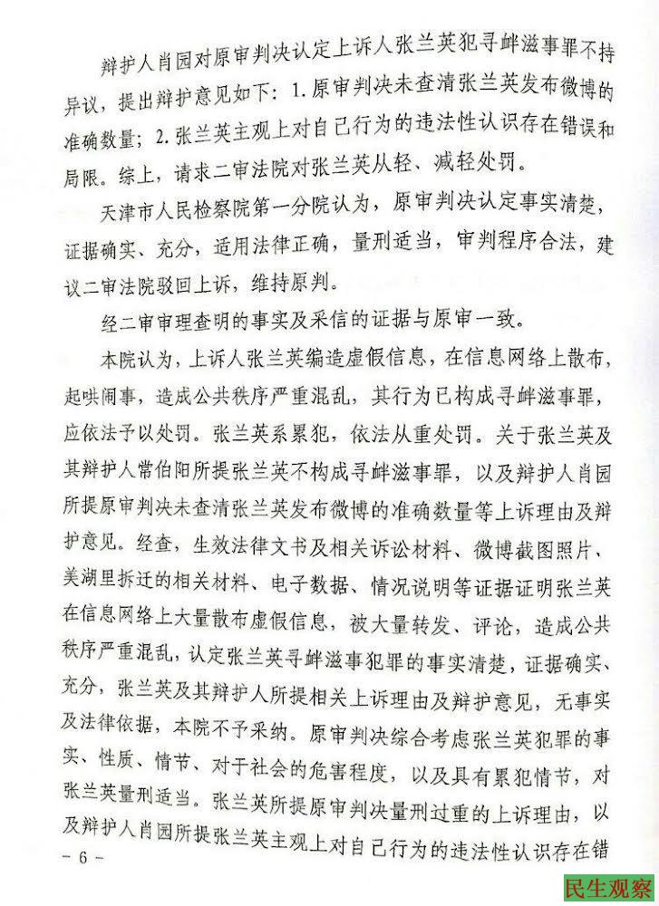 辩护人的意见是:张兰英通过微博表达不满和诉求的言论属于公民批评建议权、言论表达权以及行政诉讼法、刑事诉讼法所规定的对裁判不服的申诉权的范围,受法律保护。张兰英没有寻衅滋事的动机,其微博言论没有编造虚假事实,其言论正确与否只是价值判断问题,而非事实判断问题,张兰英不构成寻衅滋事罪。