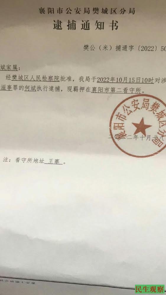 【民生观察2022年10月26日消息】湖北襄阳维权访民徐彩虹何斌夫妻俩双双被湖北襄阳检察院在10月15日批准逮蒱,目前还没有律师介入。