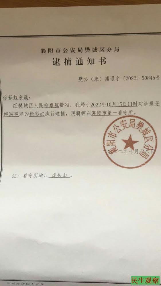 在2022年9月10日获得信息:湖北襄阳访民徐彩虹夫妻长期在北京居住维权,在前两天也就是2022年9月7日星期三由当地居委会在北京居住的出租屋里被当地接回湖北襄阳,当晚9月7号晚上12点左右到达襄阳的家里,9月8号星期四在家休息了一天,第二天星期五9月9号上午10点左右被管辖区派出所带走,徐彩虹何斌夫妻被派出所带走后,母亲担心徐彩虹何斌夫妻随后到派出所询问情况,派出所没有告诉其任何情况,直到下午17:30左右徐彩虹妈妈再次到派出所询问情况下,看到徐彩虹戴着手铐从派出所出来,说是去检查身体,如果是检查身体肯定属于拘留程序。2022年9月10号发出信息:徐彩虹与何斌夫妇二人都被刑事拘留,法律文书已经送达到家属手里。