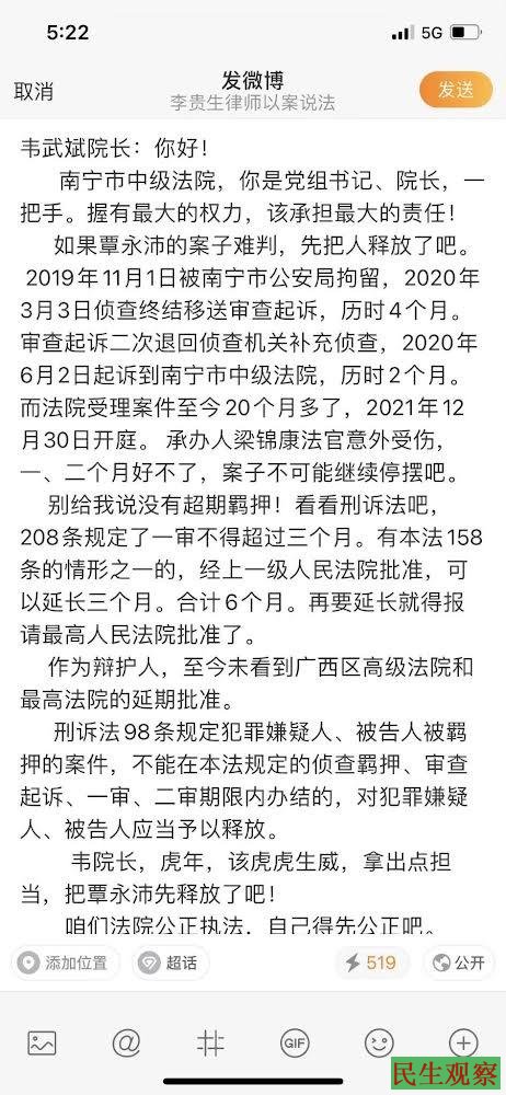 李贵生律师:上周四傍晚到南宁,周五开庭一天。为了会见覃永沛,周六日等在南宁。今早打电话给看守所,仍然以防疫为由不安排。南宁第一看守所也全员核酸,不安排律师会见。