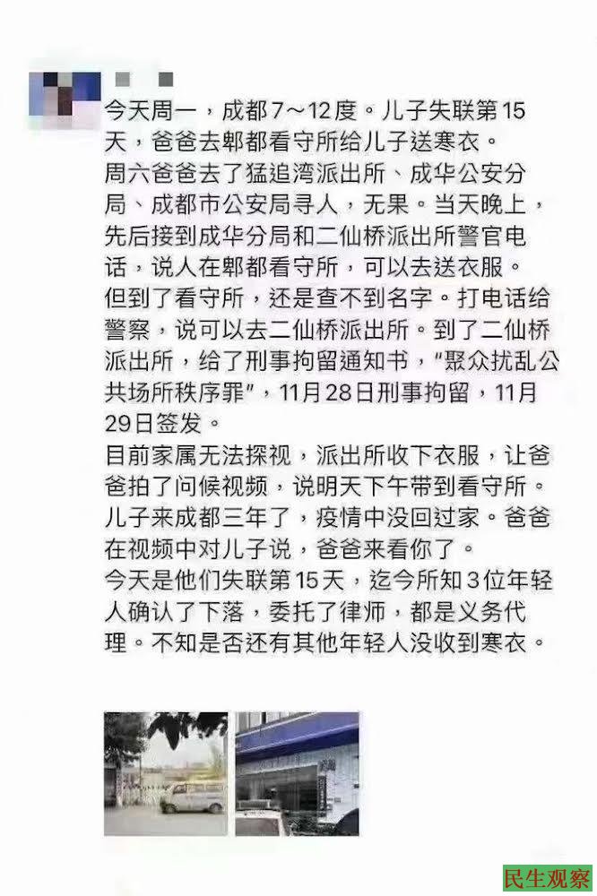 今天是他们失联第15天,迄今所知,成都3位年轻人均已确认了下落,委托了律师,都是义务代理。不知是否还有其他年轻人没收到寒衣。