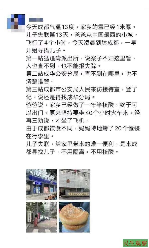 儿子失联,给家里带来的唯一便利,是来成都寻找儿子,不用隔离,不用核酸。