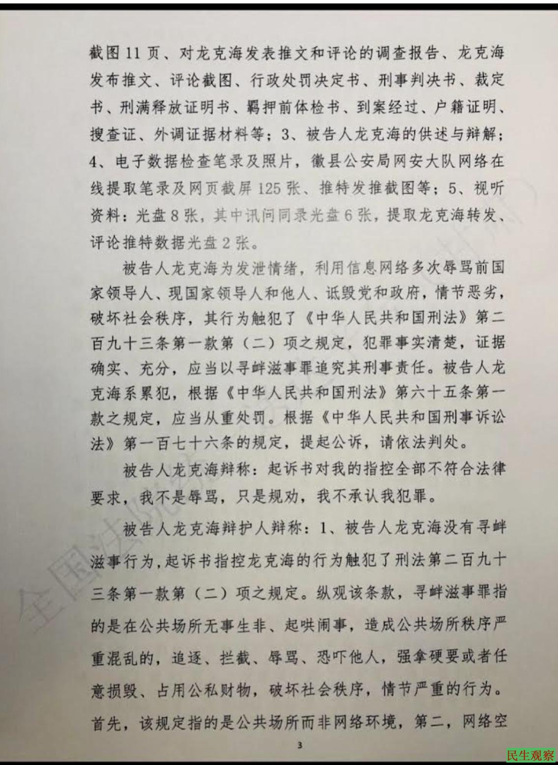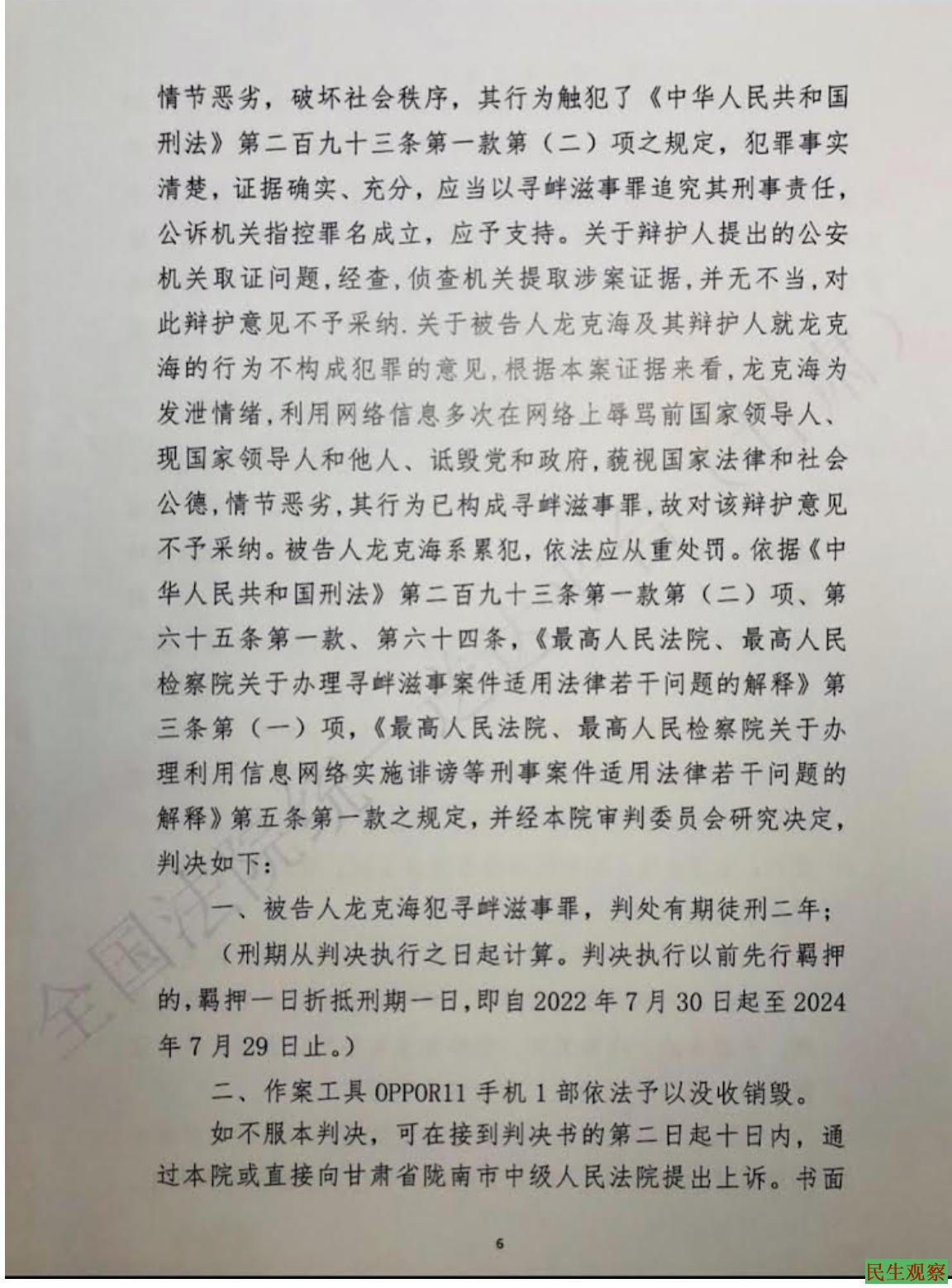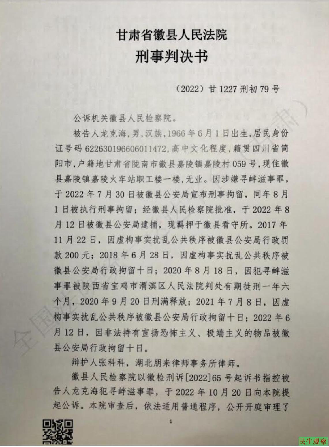 【民生观察2023年2月10日消息】本网获悉,甘肃省陇南市公民龙克海被以寻衅滋事罪判处有期徒刑2年。根据其起诉书,都是指控其在推特上的言论,可以说龙克海是因言获罪。龙克海对起诉书上的指控不认可,不认罪。