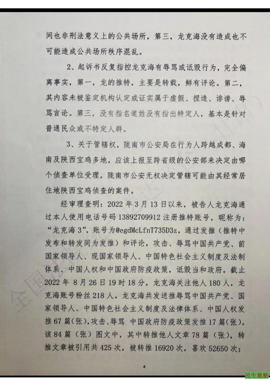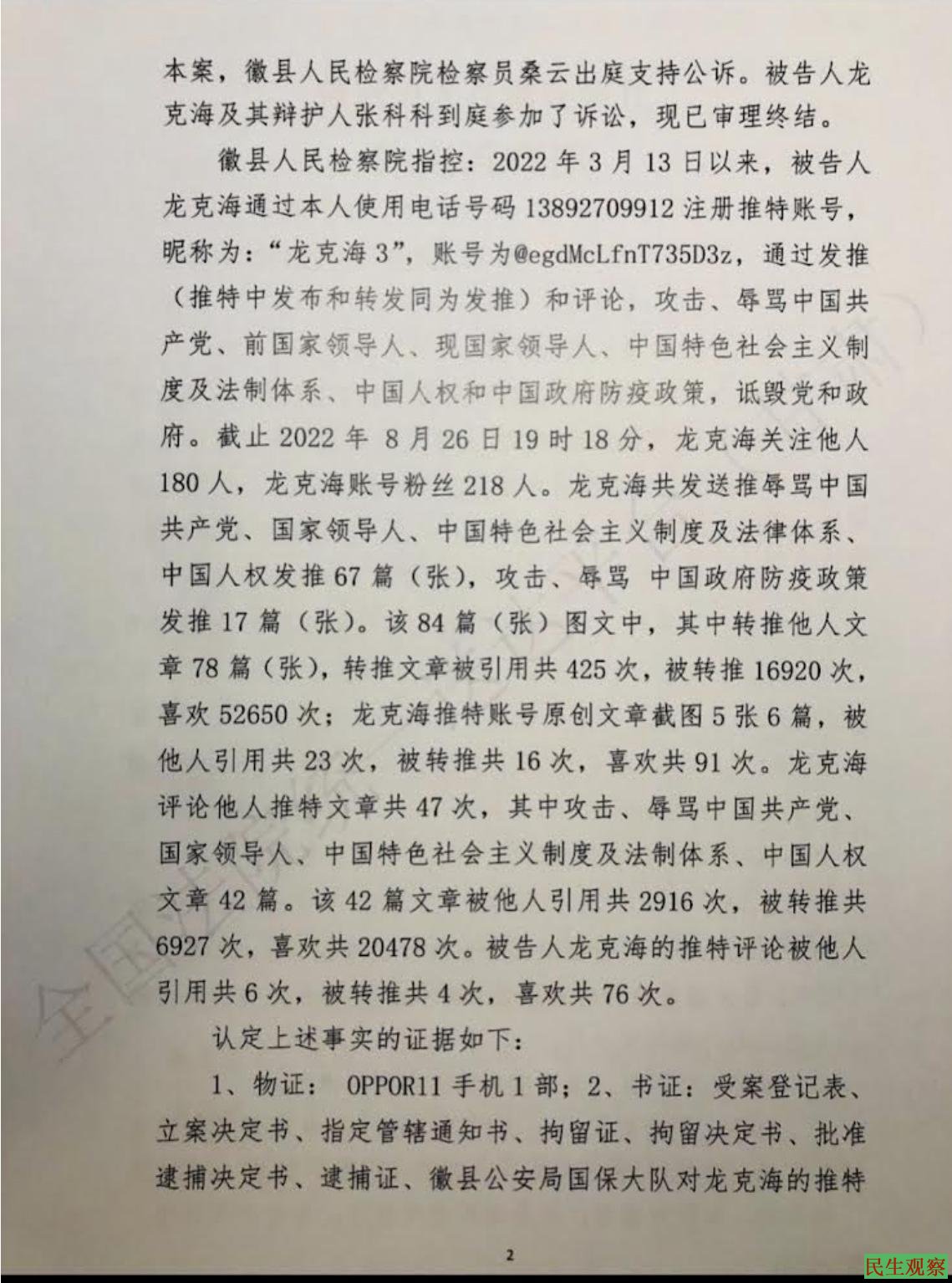根据起诉书,2022年3月13日以来,龙克海通过本人使用电话号码13892709912注册推特账号昵称为:“龙克海3,账号为6legal.fn73503z,通过发推(推特中发布和转发同为发推)和评论,攻击,辱骂中国共产党、前国家领导人,现国家领导人、中国特色社会主义制度及法制体系,中国人权和中国政府防疫政策,诋毁党和政府。