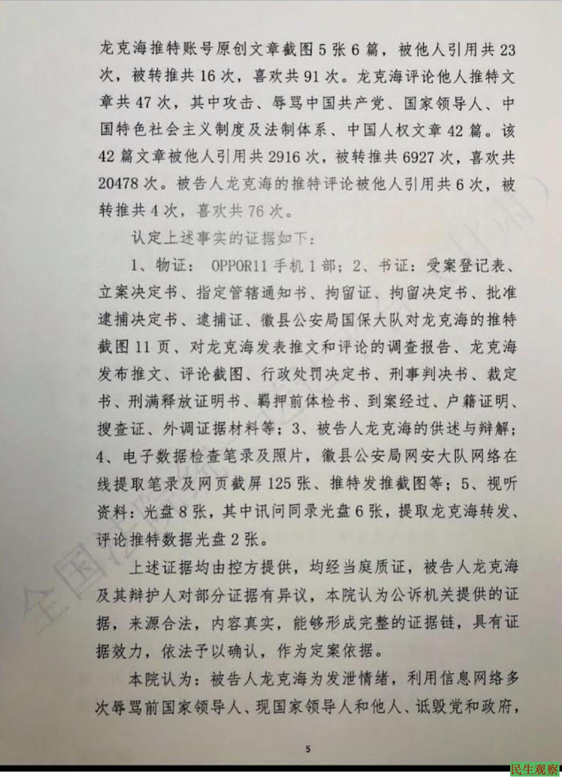 其中攻击,辱骂中国共产党国家领导人,中国特色社会主义制度及法制体系、中国人权文章42篇,该42篇文章被他人引用共2916次,被转推共6927次,喜欢共20478次,被告人龙克海的推特评论被他人引用共6次,被转推共4次,喜欢共76次,