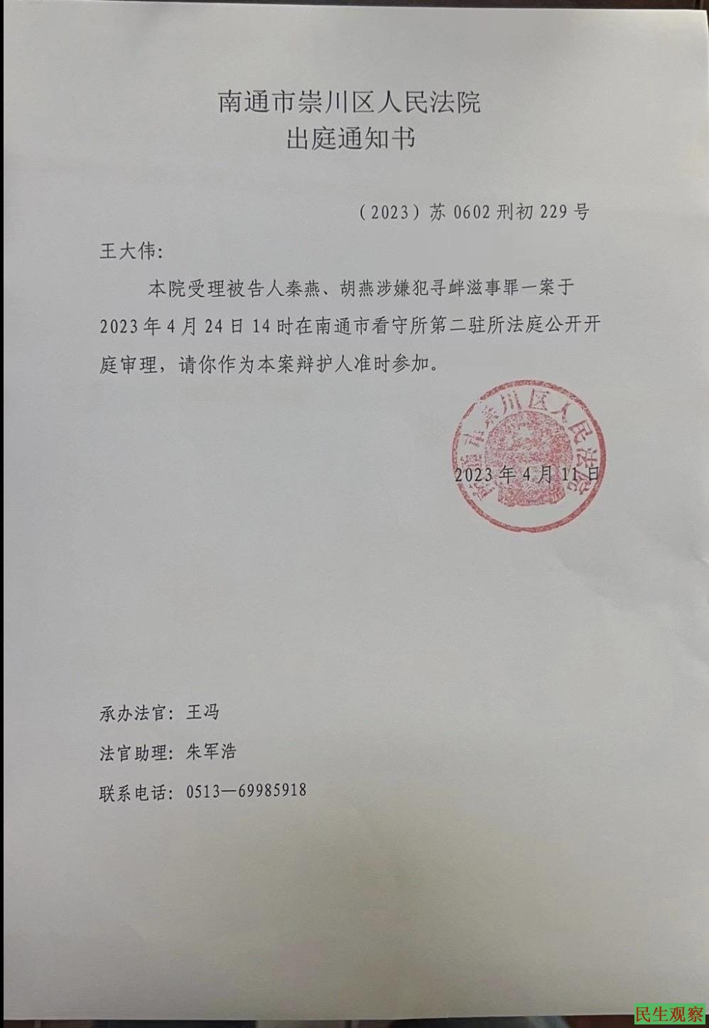 【民生观察2023年4月25日消息】江苏省南通市崇川区公民秦燕因举报公安遭打击报复,被控寻衅滋事关押至今。2023年4月24日,该案在南通看守所驻所法庭开庭审理,法院限制旁听名额。王大伟律师出庭为其辩护。
