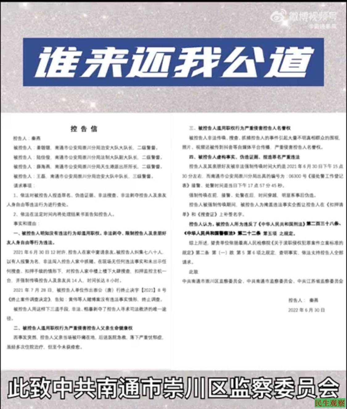 该举报视频显示:秦燕是江苏省南通市崇川区唐闸街道新园村二组4号居民。2021年6月30日,南通市崇川分局出动了几十名警察和辅警,在无任何违法事实的情况下,捏造事实伪造证据,将在秦燕家吃饭的十四名亲友,全部以涉嫌赌博的名义传唤,非法限制人身自由达八小时以上。因事发突然,导致秦燕父亲当场被吓瘫在地,后送往医院进行急救,但落下了严重的忧郁症,虽经多次住院治疗,但至今未获痊愈。
