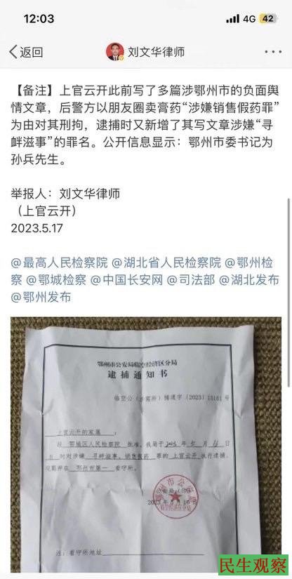 刘律表示,上官云开此前写了多篇涉鄂州市的负面舆情文章,后警方以朋友圈卖膏药“涉嫌销售假药罪”为由对其刑拘,逮捕时又新增了其写文章涉嫌“寻衅滋事”的罪名。公开信息显示:鄂州市委书记为孙兵先生。