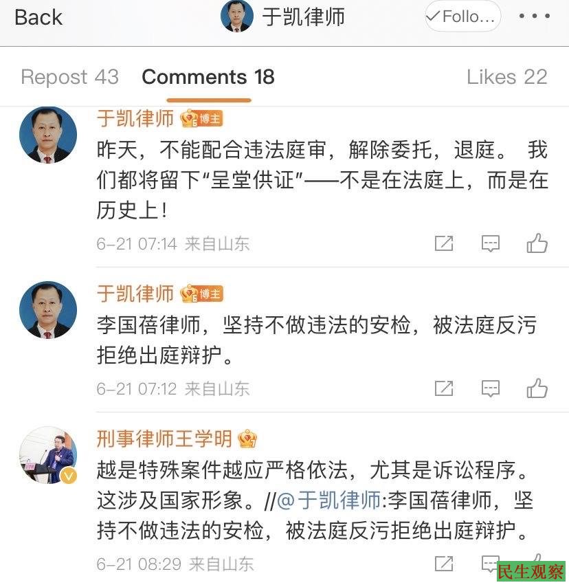 2023年6月14日,李翘楚案召开庭前会议,因进入法院要被安检,于凯律师与其理论,被临沂市中级法院反映到山东省司法厅;