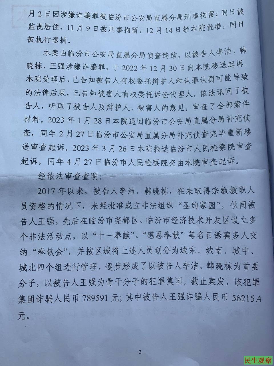【民生观察2023年6月30日消息】近日,山西临汾圣约家园教会的李洁、韩晓栋、王强三位弟兄被检察机关视为“犯罪集团”,“涉案”金额高达78万。家属听闻后不仅诧异也不同意起诉内容。