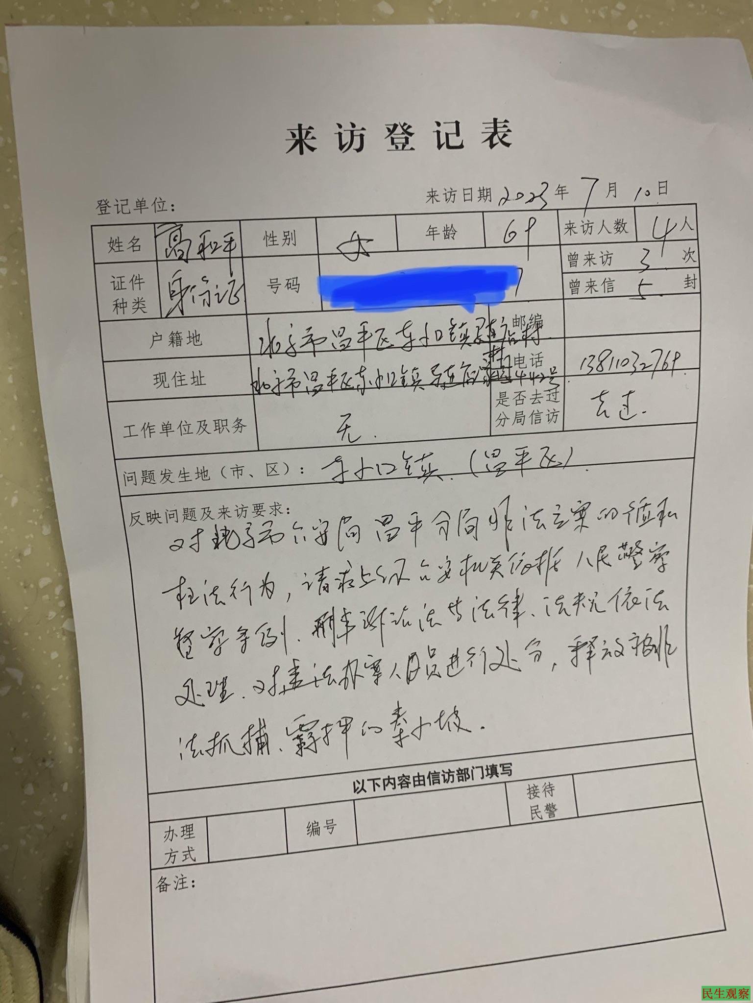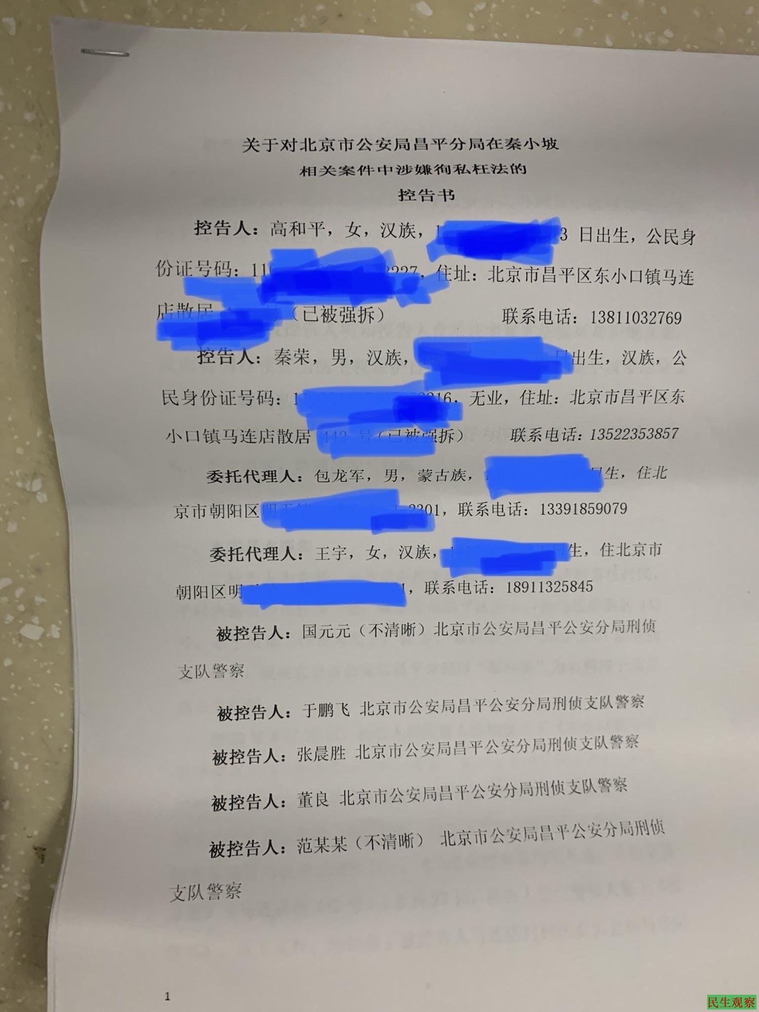 【民生观察2023年7月10日消息】本网获悉,因抵抗强拆被以“爆炸罪”逮捕的秦小坡一案,近日被北京市昌平区检察院退回公安机关补充侦查。2023年7月10日,家属和代理人前往北京市公安局信访接待室,对昌平市公安相关办案人员的徇私枉法行为进行了控告,并要求无罪释放秦小坡。