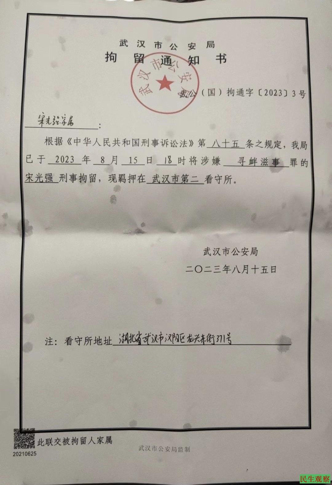 宋泽,原名:宋光强,湖北省襄阳人。据通知书显示,2023年8月15日,宋泽被武汉市公安局以涉嫌寻衅滋事罪刑事拘留,现羁押在武汉市第二看守所。看守所地址:湖北省武汉市汉阳区龙兴东街371号。