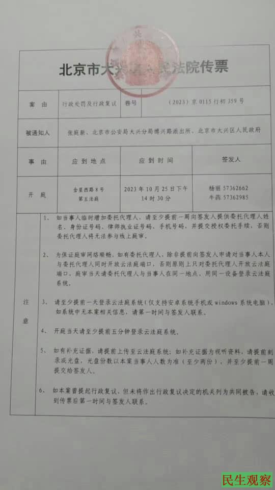 2023年10月25日张庭新再次把北京市大兴分局博兴路派出所、大兴区政府诉上法庭。由于控告了北京市政府部门,开出租车的张庭新遭遇北京出租车公司打击报复不给行驶证、不返还押金、不支付工资等不公平待遇又反遭暴力殴打,先后数次报警警方不作为,胡作为不予处理被殴打一事。