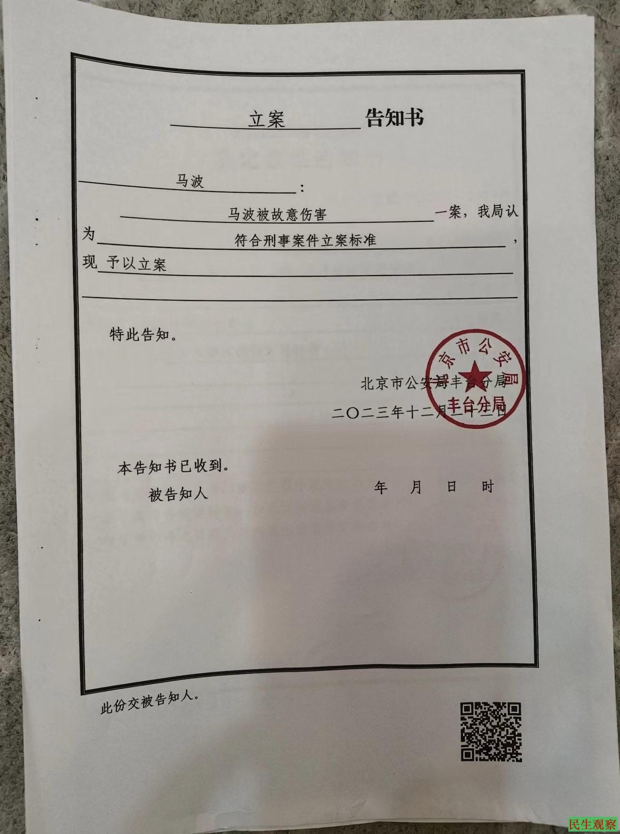 12月28日,马波终于拿到了自己的第二次伤情鉴定结果轻伤一级,丰台警方表示案件符合立案标准,已经立案进行侦查。