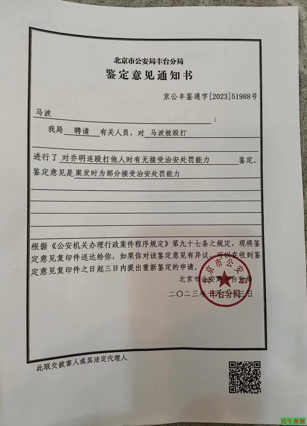 12月23日,北京市公安局丰台分局出具了立案告知书,打人者乔明莲符合刑事案件立案的标准,现决定予以立案,目前已被送到丰台区看守所。