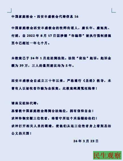 另外,2024年3月23日,中国家庭教会西安丰盛教会发出代祷信息称,西安丰盛教会的牧师传道人廉长年、廉旭亮、付娟,自2022年8月17日因涉嫌“诈骗罪”被执行强制措施至今已超过一年七个月。
