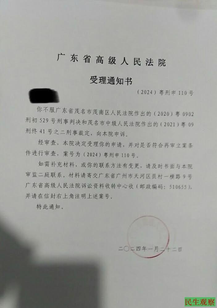 2024年1月22日,广东省高级人民法院书面通知决定受理牛腾宇母亲的申请。