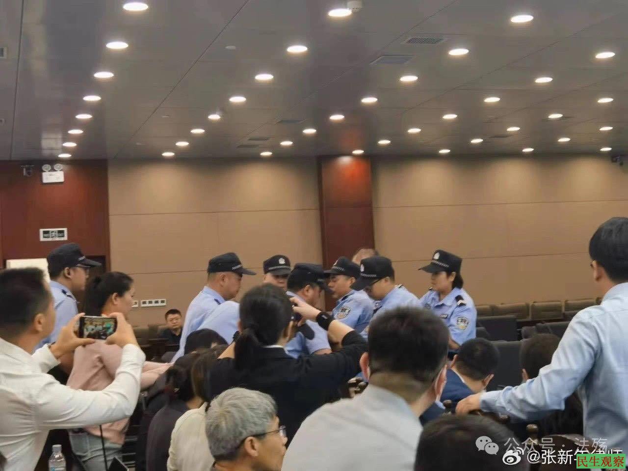 而本案庭前会议在规格上极为超限招待律师:法院大楼外停有消防车、众多法警和便衣警察、扫黑办工作人员;在法庭的走廊上,至少有将近二十个法警和巡逻警察。