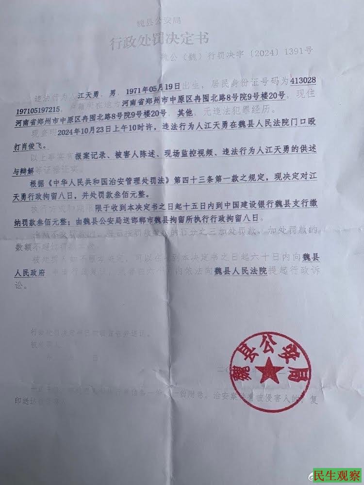 2024年10月23日,北京平安保险公司业务员刘美香被构陷贪污案在魏县法院开庭,引发江天勇、王宇、裘斌,韩亚军四人被抓,后韩亚军获释。之后确认江天勇、王宇、裘斌分别被行政拘留。