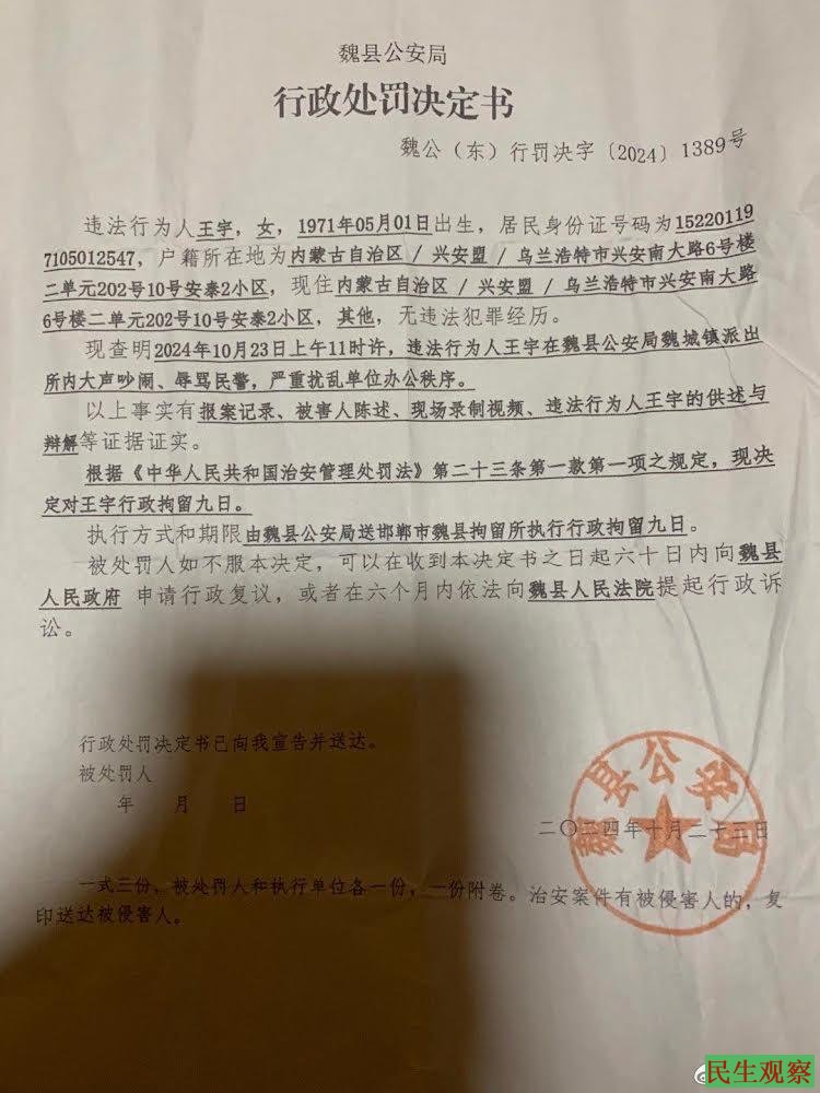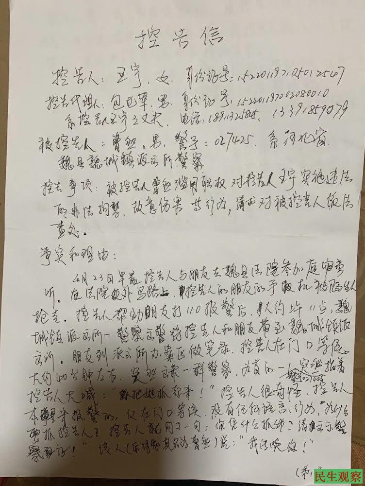 看了控告信内容,包龙军很是气愤。这才知道,王宇被带到魏城镇派出所后,一句话没说,便被非法拘禁,说她骂“抢劫犯”、“土匪”等话,完全是子虚乌有。说她扰乱魏城镇派出所工作秩序,完全是栽赃陷害。由此而对她实施行政拘留,完全是徇私枉法。