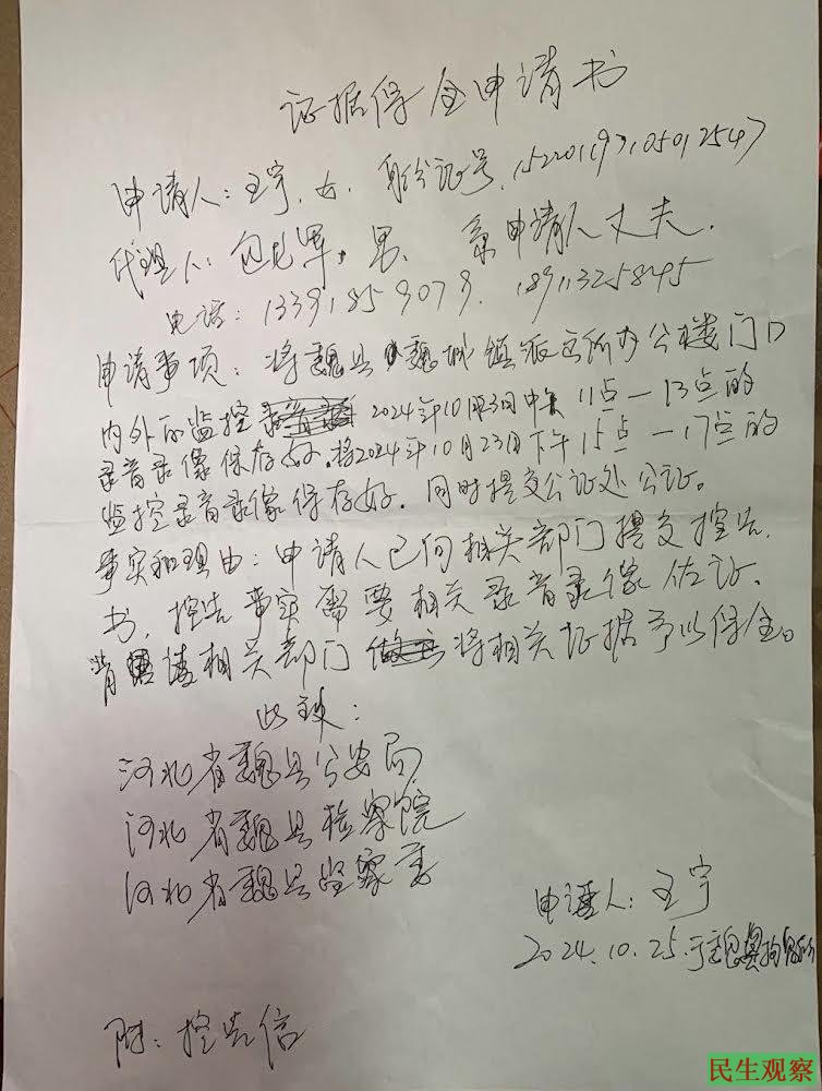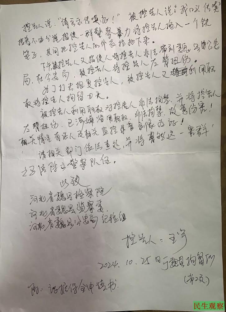 【民生观察2024年10月28日消息】2024年10月26日,律师和家属分别在魏县拘留所会见了江天勇、王宇、裘斌三人。得知王宇目前正在拘留所进行绝食抗议,被魏城镇派出所民警曹然扭伤的左胳膊已看了医生,是筋扭伤;王宇已手写一份控告信交与彭鹏律师,控告该民警徇私枉法;江天勇、裘斌二人均反映拘留所里面吃的很差。