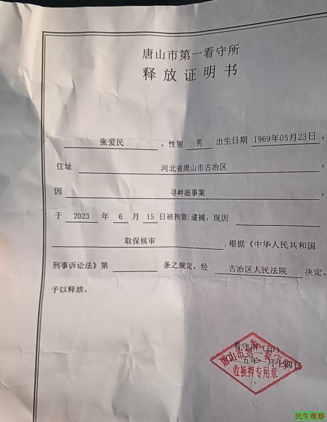 唐山维权人士张爱民获准取保候审 |