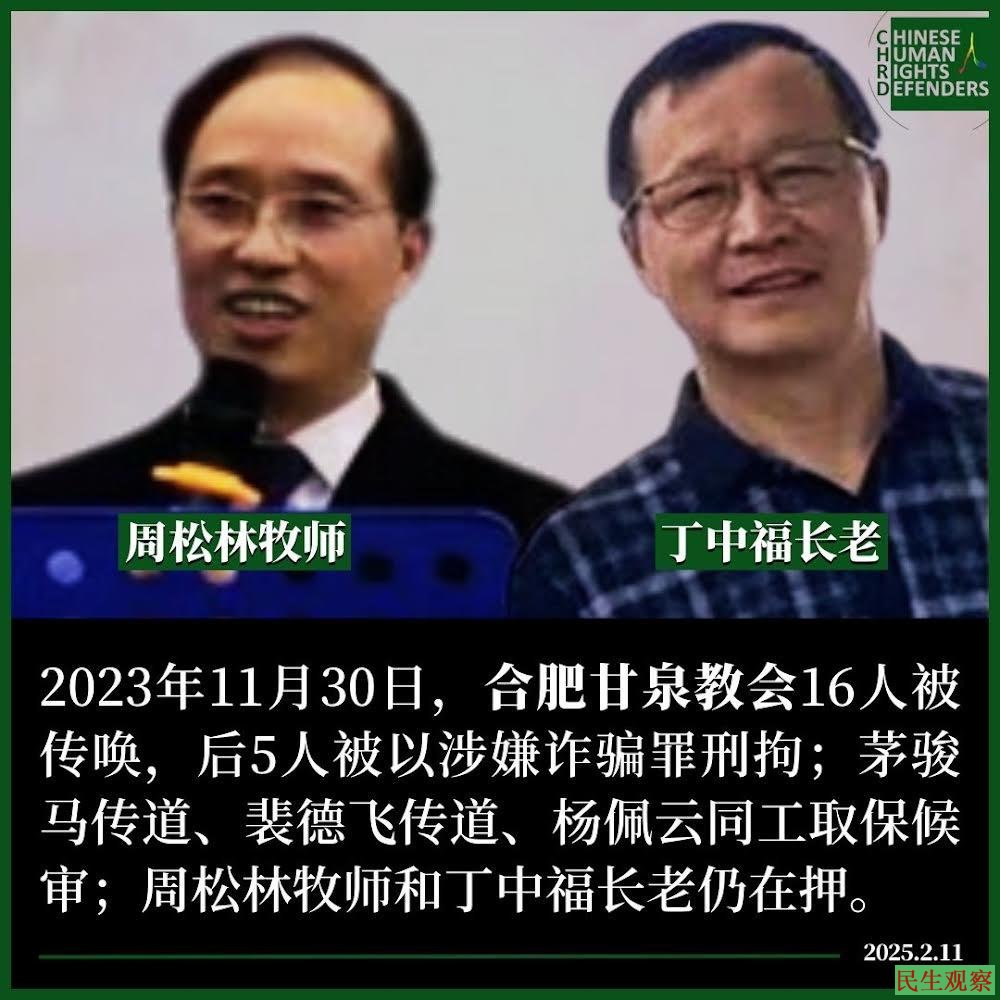 据悉,2023年11月30日早晨,合肥甘泉教会16名弟兄姐妹(其中13位为教会同工)在毫无征兆的情况下,同时被公安上门搜家,并以“诈骗罪”嫌疑被带走羁押。其后,有14位弟兄姐妺陆续被释放、取保候审。但周松林牧师、丁中福长老一直被拘押。