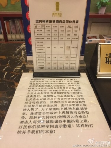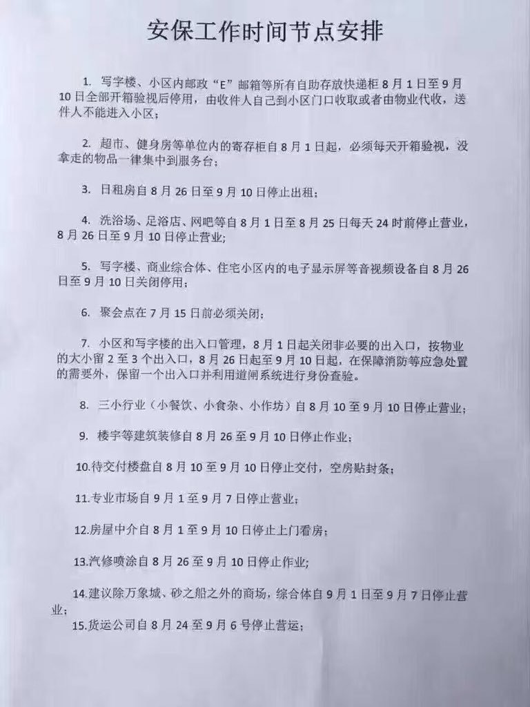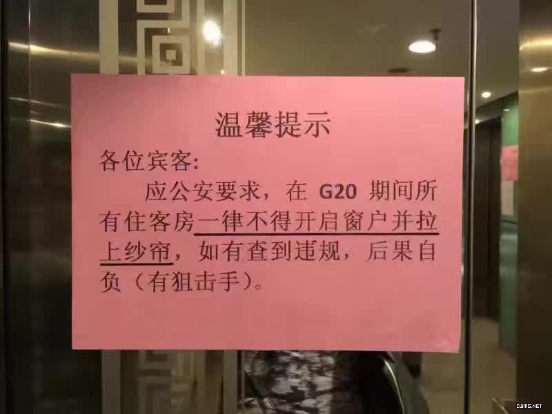 我们所能看到的是照片中空无一人的杭州街道;一张张营业、聚会、活动暂停的通知;被军车包围的G20峰会会场;杭州地铁里牵着狼犬的警察;公交车上戴红袖章的监察人员;空置房门口的封条和窗上的红色木板,以及各种不准开窗(有狙击手)的警告……连未成年的学生所背的书包都贴上封条的“安保”措施,或许用“疯狂”一词已难以概括。当然随着峰会的结束,大量维稳人员的撤离,杭州市民正逐步回到正常的生活秩序之中。可是,整个大中国的“维稳常态”却远没有结束,当局粗暴践踏人权的做法时刻存在。尽管不知道会在哪里,但下一次如此规模或程度更甚的维稳行动的发生,可能就在不远的将来。