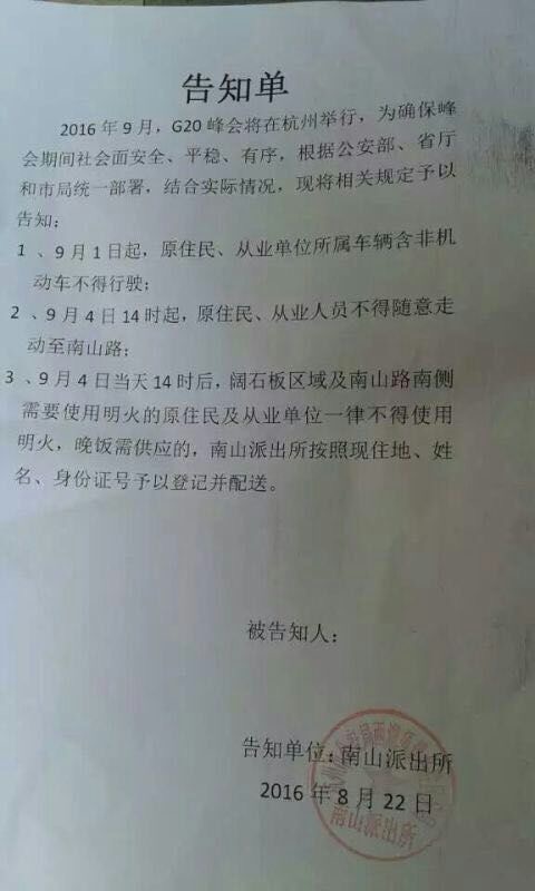 9.澎湃新闻2016年8月2日报道:8月1日起到9月6日,杭州将根据G20峰会安保任务需要,视情对住户、单位开展走访调查,核查登记人员、房屋等信息,排查安全隐患。根据《浙江省人民代表大会常务委员会关于授权省及设区的市人民政府为保障二十国集团领导人第十一次峰会筹备和举办工作规定临时性行政措施的决定》,杭州市政府1日连续发布《关于加强留宿场所安全管理的决定》、《关于开展走访调查工作的通告》、《关于对烟花爆竹安全管理采取临时性行政措施的决定》。