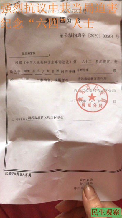 据民生观察报道,湖北籍居住于广州市的维权人士张五洲因于“六四屠杀”31周年之际举牌纪念英烈及抗议中共人大通过的“国安法”立法授权,而遭到广东警方以涉嫌“寻衅滋事罪”刑事拘留并抄家,现羁押于清城区看守所。湖南省株洲市公民陈思明因纪念“六四”31周年,被株洲警方行政拘留十五天。另有四川维权人士、八九民主运动参与人陈云飞因在网络发表纪念言论被警方带走控制,云南维权人士、诗人、艺术家王藏“六四”前被警方拘押。中共当局如此种种对纪念“六四屠杀”31周年的人士迫害的行径,事实是在延续“六四屠杀”的罪恶,在肆意侵犯公民言论自由等基本人权,应该受到世界一切正义力量的严正谴责与抗议!