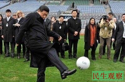 中共党魁习近平堪称足球运动最有权势的球迷,他喜爱足球是人尽皆知的事,2008年8月,已在中共17大成为“接班人”的习近平到德国访问拜耳集团时公开放言说他喜欢足球。他在美国和欧洲访问,数次走下绿茵场,踢足球射门或试脚。2011年7月,习近平在北京会见了韩国议员时表示:“中国世界杯出线、举办世界杯比赛及获得世界杯冠军是他的三个愿望。”据官方媒体报导,一张习近平2012年在爱尔兰都柏林体育场踢足球的照片就摆在他的办公室里。