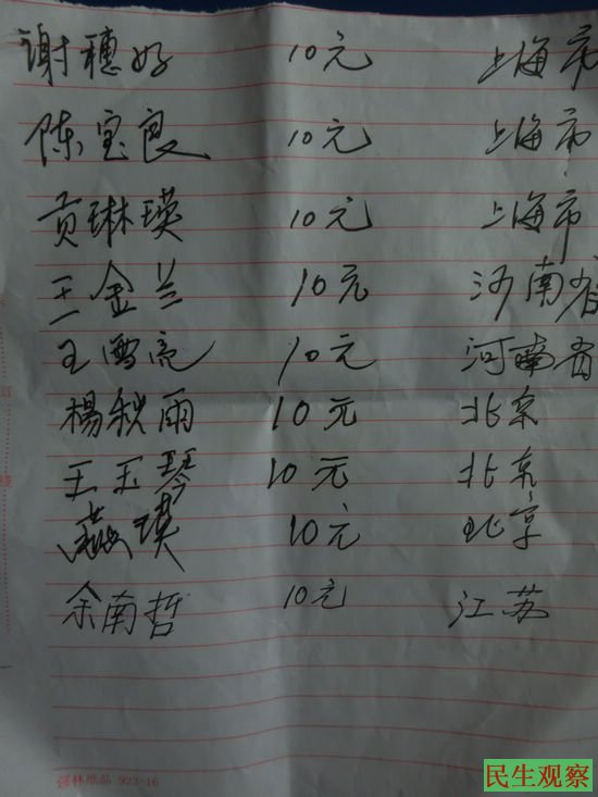 据了解,今天下午1点多钟,北京维权人士杨秋雨、江西彭中林、上海吴玉芬、郑培培、韦开珍、辽宁赵广军、王素娥、南京汤素秀等28名维权访民,到北京市朝阳区看守所为曹顺利献爱心、存款(名单附后),遭到看守所警察拒绝,说刚刚出的新规定,不给开门。下午2点后,曹顺利的代理律师王宇来约见曹顺利,并带为28名维权访民捐款给曹顺利存钱,也遭到拒绝,看守所工作人员说23日刚刚出了的新规定,隔着工作台大家看到本月23日刚刚印发的针对维权人士和访民的文件,今后访民为拘留在押的维权访民存款将被拒之门外,王宇律师在看守所接待大厅打电话与上级公安投诉、交涉一个多小时,也没有结果。