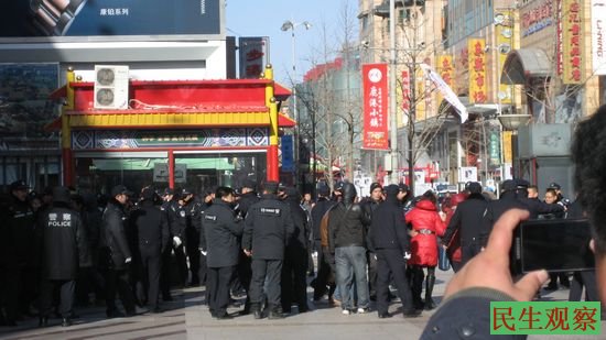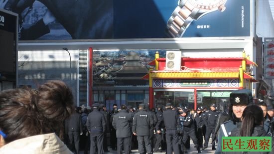 民生观察工作室2013-11-27消息:今天下午一点,来自不同省份的上百位艾滋病感染者在王府井步行街抗议,呼喊口号,要求国家赔偿及更好的治疗条件。王府井步行街行人众多,抗议行动获得多名行人关注。约半小时后,上百名警察、保安围成人墙包围了他们,同时阻止周围的游人、购物者靠近,随后将感染者抓进一辆公交车。