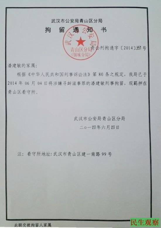武汉被刑拘公民潘建敏母亲去世 家属申请其出殡 |