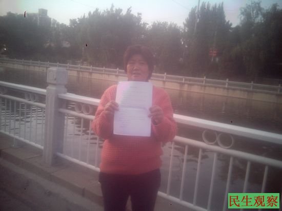 民生观察工作室2014-12-12消息:河南洛阳嵩县田胡镇黄门村村民关五玲,因举报村里的村支书等人倒卖村土地,贪污国家给烟农的扶持款等问题,被当地的维稳部门多次拘留、训诫。
