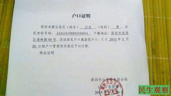 民生观察工作室2015/5/20消息:深圳维权人士汪龙告诉本工作室,今天中午11:30许,深圳市公安局龙岗分局人口管理科、深圳市公安局龙岗分局新城派出所、深圳市公安局龙岗分局龙新派出所以及深圳市龙岗区龙岗街道办事处的近数十人来到他狭小的出租屋,向他送达了户口注销证明。