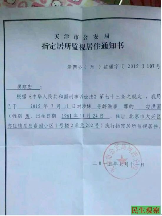 民生观察工作室2015/7/13消息:在本月10日的大肆抓捕中被抓的北京基督徒戈平(勾洪国)已被天津警方执行指定场所监视居住。同日被抓的著名民主人士胡石根先生、基督徒刘永平(老木)至今下落不明。