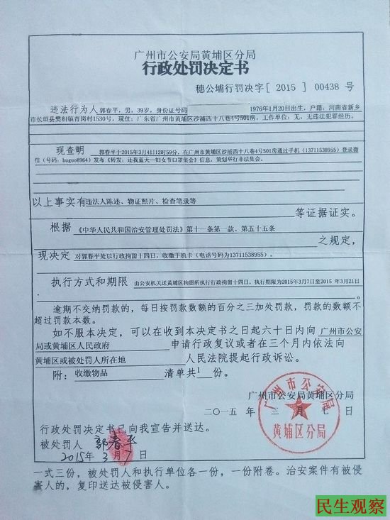 民生观察工作室2015/7/15日消息:2015年3月4日,郭春平在微信上转发《还我蓝天——妇女节口罩集会》的信息,3月7日下午,广州黄埔区公安分局以此举属于策划非法集会为由,对他行政拘留14天。