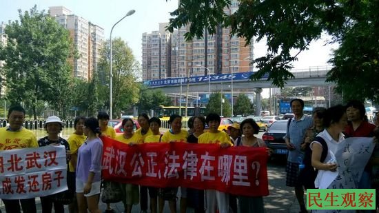 民生观察工作室2015-8-20消息:今天十数无家可归的在京访民在北京南站,北京市政府非紧急救助热线(12345)的宣传牌前打横幅 “要求无罪释放良心律师”“严厉打击拦截、判刑、刑拘访民”的行为,武汉访民则身穿访民文化衫打出了“武汉公证法律在哪里”的横幅。