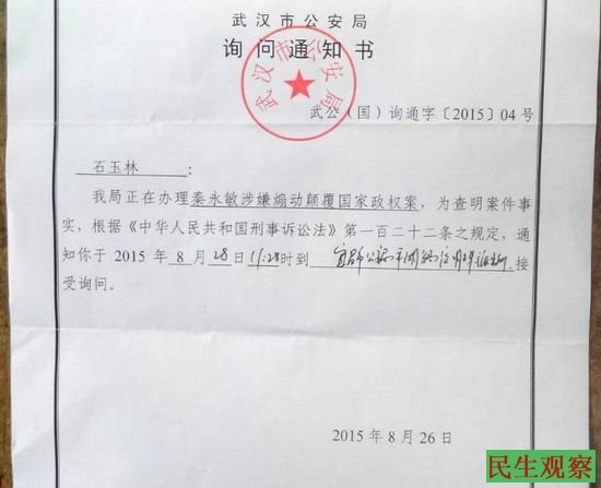 近日,同为中国人权观察(注册中)成员之一的湖北省宜昌市公民石玉林,在8月26日被武汉市公安局传讯。内容大致为:我局(武汉市公安局)正在办理“秦永敏涉嫌煽动颠覆国家政权案”,为查明案件事实,依据《中华人民共和国刑事诉讼法》第一百二十二条之规定,通知你于2015年8月28日11:28时到“宜昌市公安局平湖分局夜明珠派出所”接受询问。