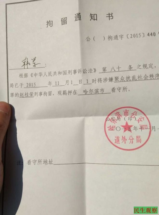 黑龙江哈尔滨赵桂荣被以聚众扰乱社会秩序罪刑拘