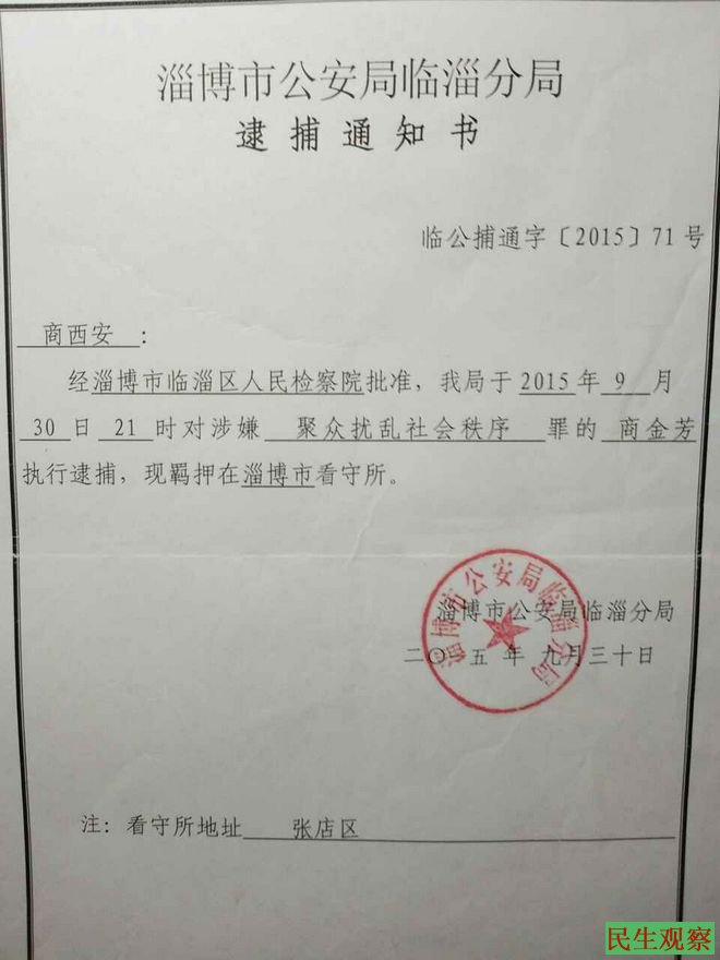 民生观察工作室2015年11月7日消息:2015年8月23日下午,山东省淄博市临淄区稷下街道办事处商王村维权人士商金芳,在送孩子上学途中被临淄区公安局强行带走,于24日被以〝聚众扰乱社会秩序〞的罪名刑事拘留,同期被以同种罪名刑拘的还有临淄区稷下街道办尧王村的维权人士胡明德。